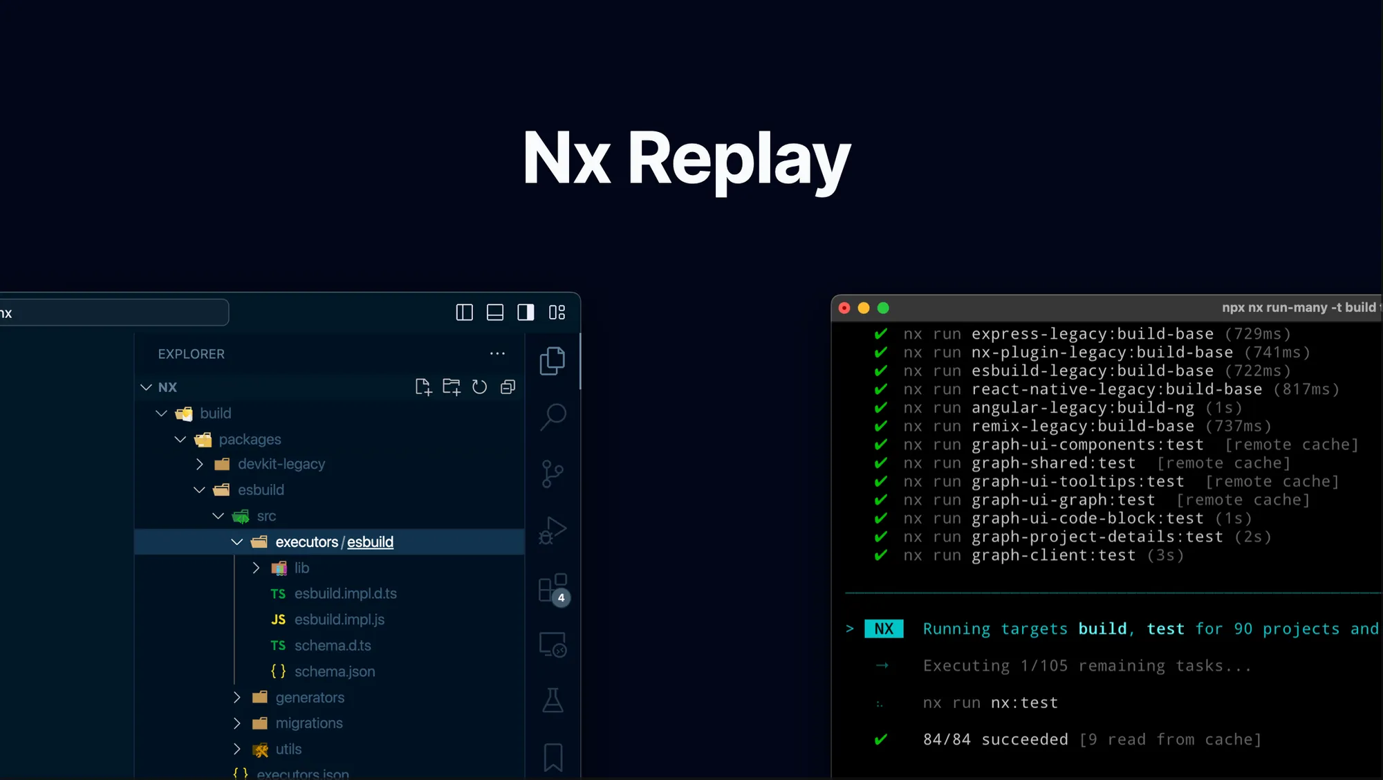 Nx Replay enables caching and reusing of task results. It’s our well known Nx remote cache! It allows developers to avoid re-running expensive tasks by retrieving the cached results from a remote cache. This significantly improves build and test performance, as well as developer productivity. Nx Replay is also critical to the functioning of Nx Agents, which rely on the remote cache to ensure that the results of a task will be shared with every agent that needs them. By using Nx Replay, developers can optimize their workflows and reduce the time spent waiting for tasks to complete.